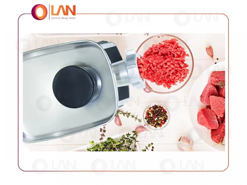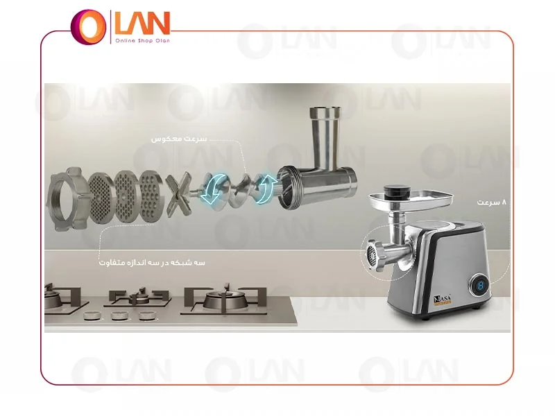 ۲. عملکرد فنی و توان موتور: موتور ۱۸۰۰ واتی NS‑313 از همان ابتدا برای نیاز خانگی طراحی شده است — نه صنعتی، اما کاملاً قدرتمند برای حجم های متوسط تا زیاد گوشت. این موتور، توانایی چرخ کردن حدود ۱.۸ تا ۲ کیلوگرم گوشت در دقیقه را دارد که برای خانواده های ۴ تا ۶ نفره بیش از حد کافی است. یکی از نقاط قوت NS‑313 داشتن ۸ سطح سرعت قابل تنظیم است. کنترل سرعت توسط ولوم چرخشی روی بدنه انجام می شود، که حالت کلاسیک اما بسیار کارآمدی دارد. این کنترل دقیق سرعت برای کارهایی مثل چرخ کردن گوشت نرم، پردازش مخلوط دل و جگر، یا درست کردن خمیر سوسیس بسیار حیاتی است — چون در دستگاه های تک سرعته، احتمال له شدن بافت گوشت یا گیر کردن آن در دیسک زیاد است. ویژگی کاربردی دیگر، عملکرد معکوس (Reverse Function) است. در مواقعی که تکه های گوشت چرب یا ماهی در شبکه گیر می کند، کاربر می تواند با فشردن دکمه ی معکوس، حرکت تیغه را برای چند ثانیه برعکس کند و مسیر را باز نماید. این قابلیت ساده اما حیاتی، عمر تیغه و موتور را به شدت افزایش می دهد. نمایشگر دیجیتال LCD در قسمت بالایی بدنه، برای نشان دادن وضعیت سرعت، حالت معکوس و هشدار عملکرد موتور طراحی شده است. وجود نمایشگر در یک چرخ گوشت اقتصادی، امتیاز مهمی است، زیرا به کاربر حس کنترل دقیق بر فرایند چرخ کردن می دهد.
