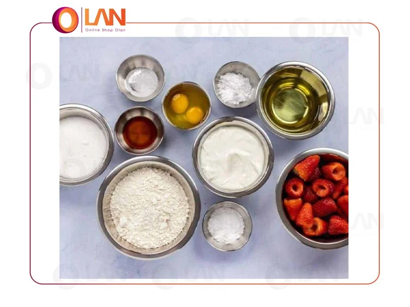 تخم مرغ، شکر دانه ریز، خامه ترش، روغن، عصاره وانیل، آرد همه منظوره، پودر خمیرمایه، نمک، توت فرنگی (تازه)، پکینگ پودر