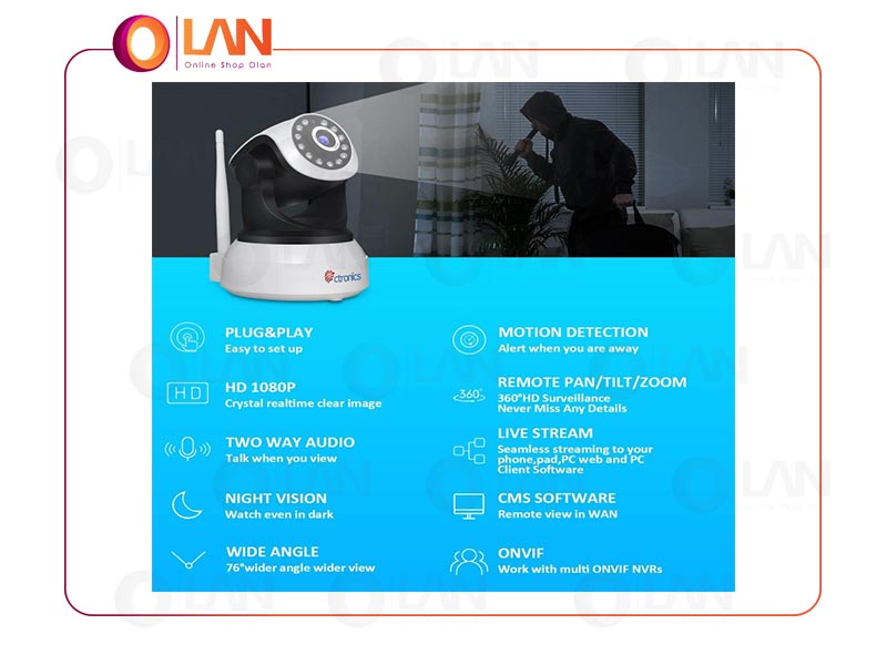 امنیت در هر کار و هر مکانی، جز اولویت ها می باشد و امروزه با استفاده از دوربین های امنیتی این کار انجام می دهد. در سال های پیش، در فضای بیرون بیش تز از دوربین های امنیتی استفاده می شد، اما امروزه در فضاهای داخلی مانند خانه، محل کار و اتاق های خواب استفاده می شوند. دوربین های امنیتی داخلی بیشتر به ما کمک می کنند تا بر فضای خانه نظارت داشته باشیم و کودکان یا حیوانات خانگی زیر نظر داشته باشیم تا بتوانیم از آن ها محافظت کنیم. امروزه دوربین های امنیتی مدل های متفاوتی دارند که هر کدام کارایی مختلفی را ارائه می دهند. برخی از این دوربین های امنیتی داخلی بر روی زمین قرار می گیرند و برخی دیگر روی سقف نصب می شود. امروزه می خواهیم یک دوربین امنیتی فوق العاده را به شما معرفی کینیم که توسط یک برند معتبر تولید شده است. این محصول بی نظیر، دوربین امنیتی IP با کیفیت Full HD برند Ctronics می باشد که شما می توانید امنیت خانه از جمله کوکان و حیوانات خانگی را تضمین کنید. این دوربین خفن می تواند تمام فضای اتاق را زیر نظر داشته باشد و آن ها را کاملا ذخیره کند.