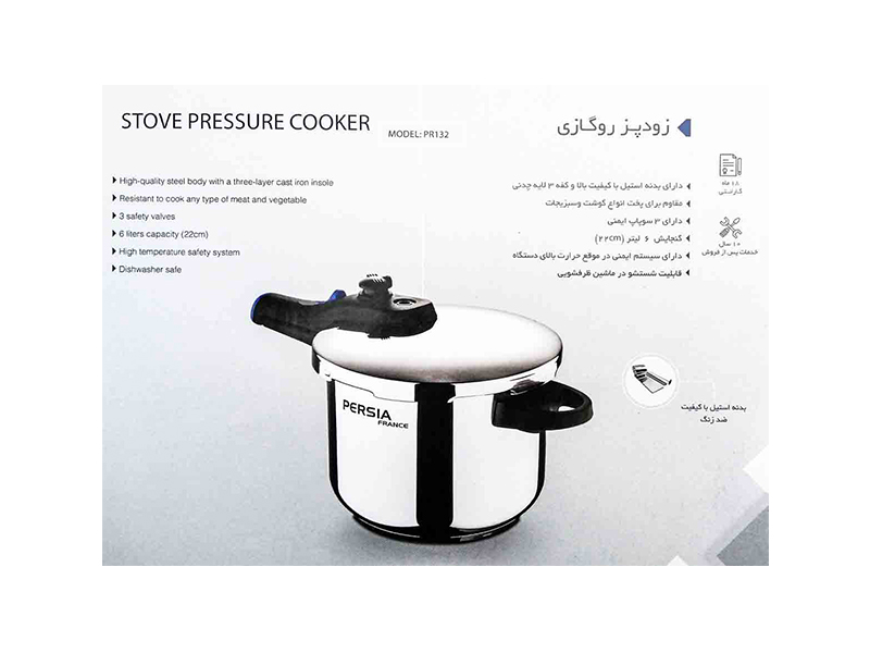 زودپز روگازی پرشیا مدل PR 132 مناسب پخت سریع و فشرده انواع مواد غذایی میباشد در کوتاه ترین زمان ممکن با حفظ تمامی ویتاومین و املاح مواد غذایی می باشد.شرکت پرشیا فرانس بدنه ی این محصول را بسیار مقاوم طراحی و تولید کرده است شایان ذکر است که در طراحی ساخت خود از یک دسته و دستگیره پلاستیکی عایق بهره مند است که امکان جابه جایی و حمل آن را بسیار آسان می کند. باز و بسته کردن درب زودپز روگازی Persia France از مکانیسم بسیار سادهای برخوردار است و با استفاده از دکمهای که روی دسته آن تعبیه شده است قفل گردیده و این محصول بیشترین سطح ایمنی را داراست.