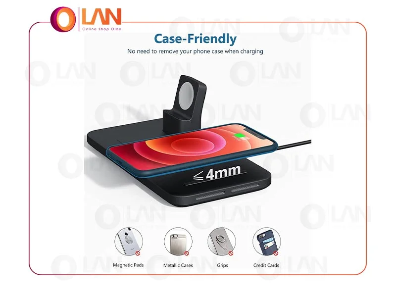 شارژ کردن با کاور گوشی: این پد گوشی های شما از طریق اکثر قاب های گوشی تا 5 میلی متر شارژ می شود. ضخامت 5 میلی متری قاب های گوشی، نیازی به برداشتن قاب از گوشی نمی باشد. نکات: پاپ سوکت های آهنربایی یا فلزی را از قاب گوشی/تلفن خود جدا کنید. قاب محافظ ناسازگار را از قاب شارژ اپل واچ بردارید. نشانگر ظریف وضعیت شارژ شما را نشان می دهد و در خواب شما اختلالی ایجاد نمی کند.